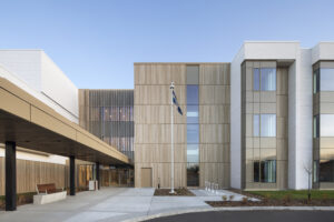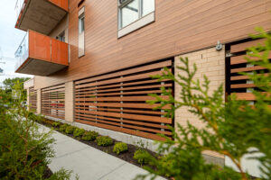 A 96-unit residential building dedicated to families and individuals with special needs, located in Quebec City. Maibec provided Jatoba medium (204-08) printed-texture aluminum planks and battens for this project, which focuses on social inclusion, sustainability, and quality of life. The spaced battens create a partial visual barrier while preserving natural light and airflow, transforming a functional element into an architectural signature.
