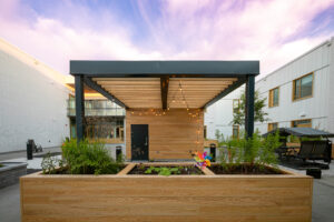 Our natural Hickory (122-01) HD digitally printed architectural planks and battens were selected for the landscaping of the courtyard garden. The creative use is demonstrated through the seamless integration of the pergola and raised planters, where HD printing faithfully reproduces natural wood grain to create a warm refuge at the heart of the communal space.