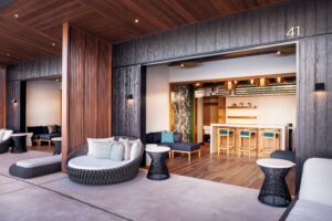 This project features Maibec’s 8-inch flat-profile aluminum planks with HD-printed Jatoba texture. Battens in the same texture serve as screens for private cabanas, providing ventilation and natural light while maintaining privacy.