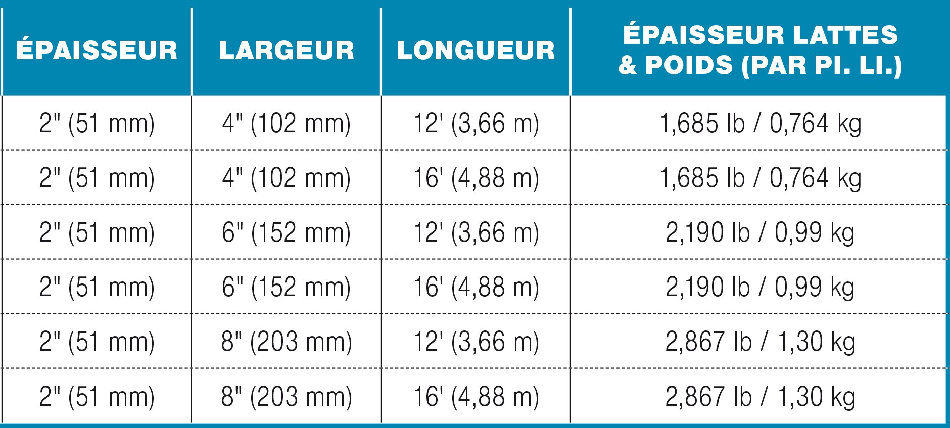 Longueurs standards de 12′ [3,7 m] et de 16′ [4,9 m]